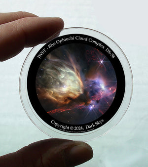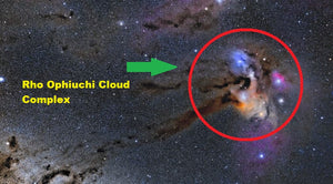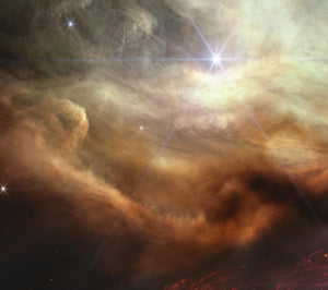 The Rho Ophiuchi cloud complex small star region, chaotic, resembling explosions in this image from NASA James Webb, space telescope, display field of about 50 young stars many of them similar to our sun. The yellow orange color comes from tiny, green hydrocarbon dust structures and textures unlike anything we have seen before the striking large, red vertical stellar outflow twin powerful jets of material that occurred during the early stages of star formation.
