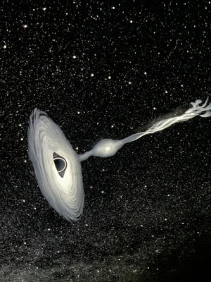 Al igual que nuestro disco "Agujero Negro", te embarcarás en un viaje imaginativo para descubrir cómo se vería un agujero negro desde una perspectiva diferente. Un chorro de un agujero negro es un haz de plasma potente y estrecho que se dispara desde un agujero negro a casi la velocidad de la luz. La gravedad y la rotación hacen que la materia forme un disco alrededor de un agujero negro. El rápido giro del disco ioniza la materia, creando un plasma denso con campos magnéticos entrelazados. La rotación del agujero negro transforma los campos magnéticos en conos en sus polos, expulsando materia en forma de chorros.